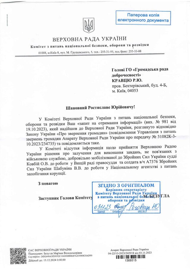 Лист ВРУ щодо відсутності дозволу про залучення Шабуніна В.В. до служби у НАЗК
