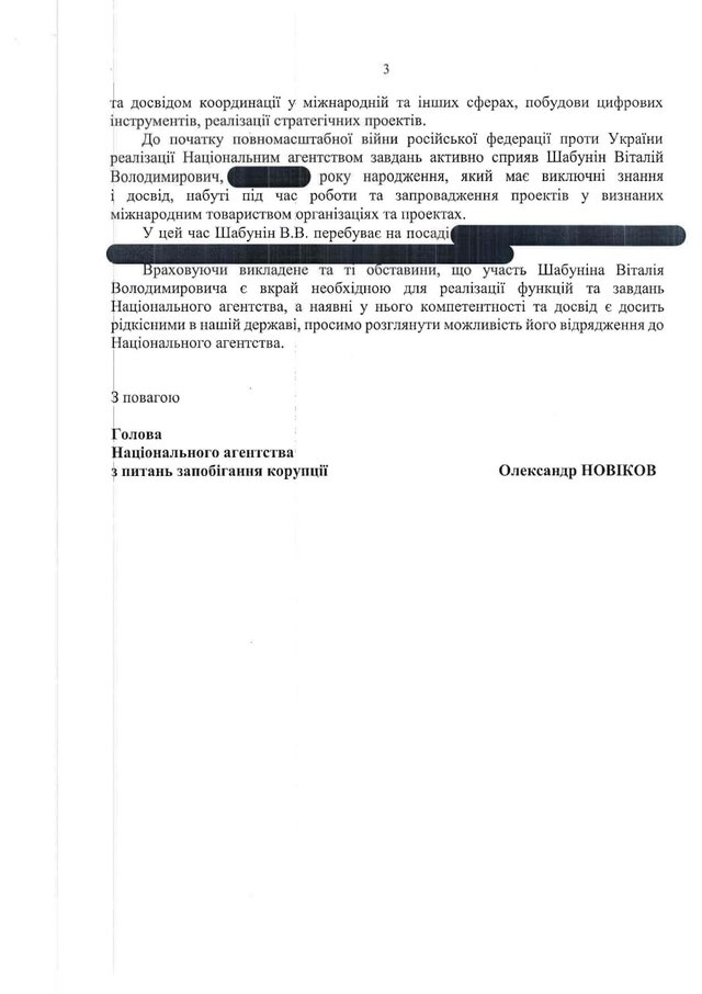 Витяг листа НАЗК, яким вони просили відрядити солдата Шабуніна В.В. до НАЗК