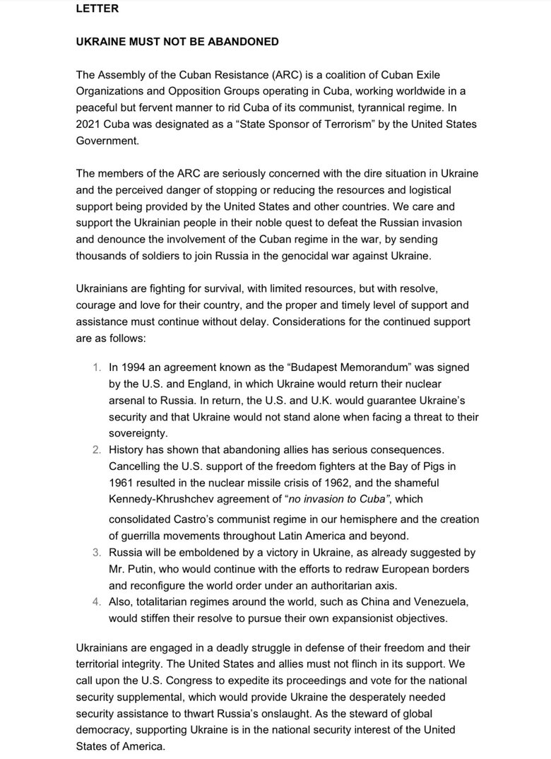 Кубинські американці звернулись до Конгресу з закликом підтримати допомогу Україні.