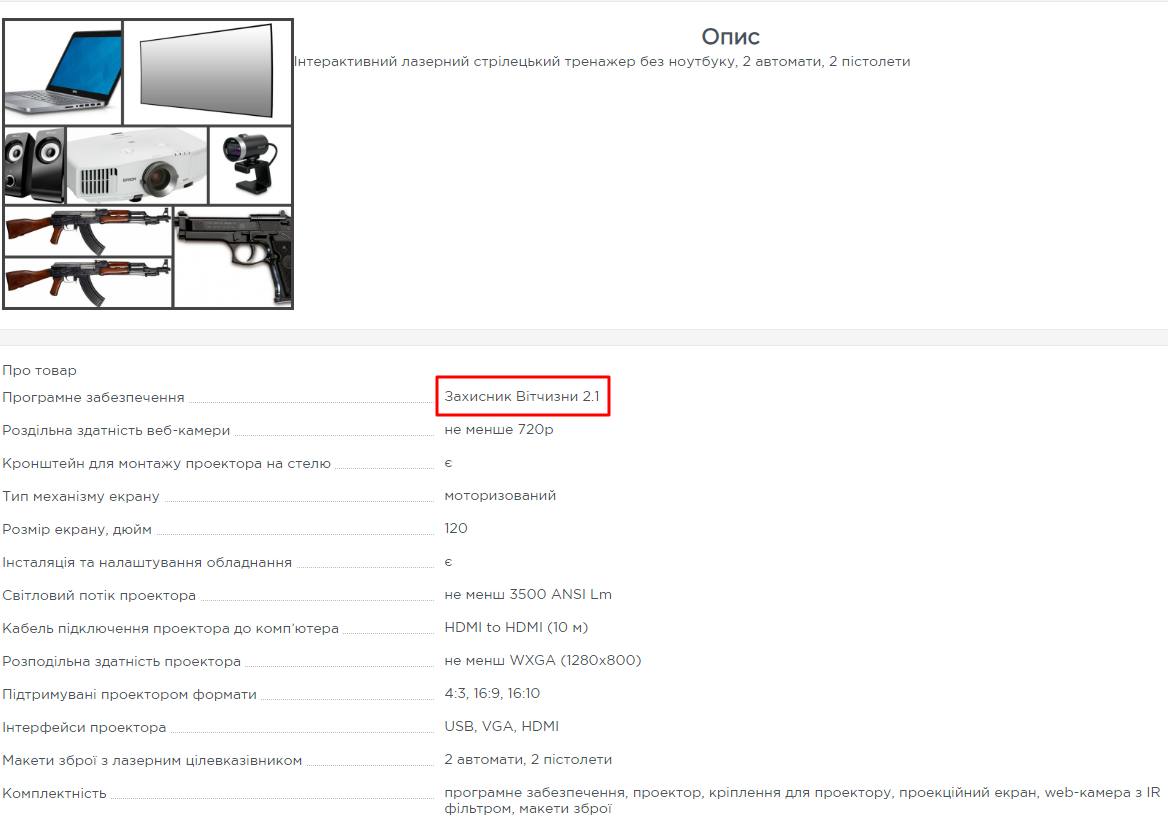 Якщо детальніше розглянувши характеристики даної позиції на Prozorro Market , то можна побачити цікаву деталь – програмне забезпечення конкретної моделі Захисник Вітчизни 2.1