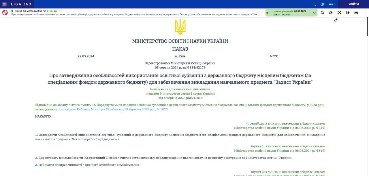 Почнемо з матчастини, тобто документів. 22 травня 2024 року за підписом Оксена Лісового був виданий Наказ №731 «Про затвердження особливостей використання освітньої субвенції з державного бюджету місцевим бюджетам (за спеціальним фондом державного бюджету) для забезпечення викладання навчального предмета „Захист України“.