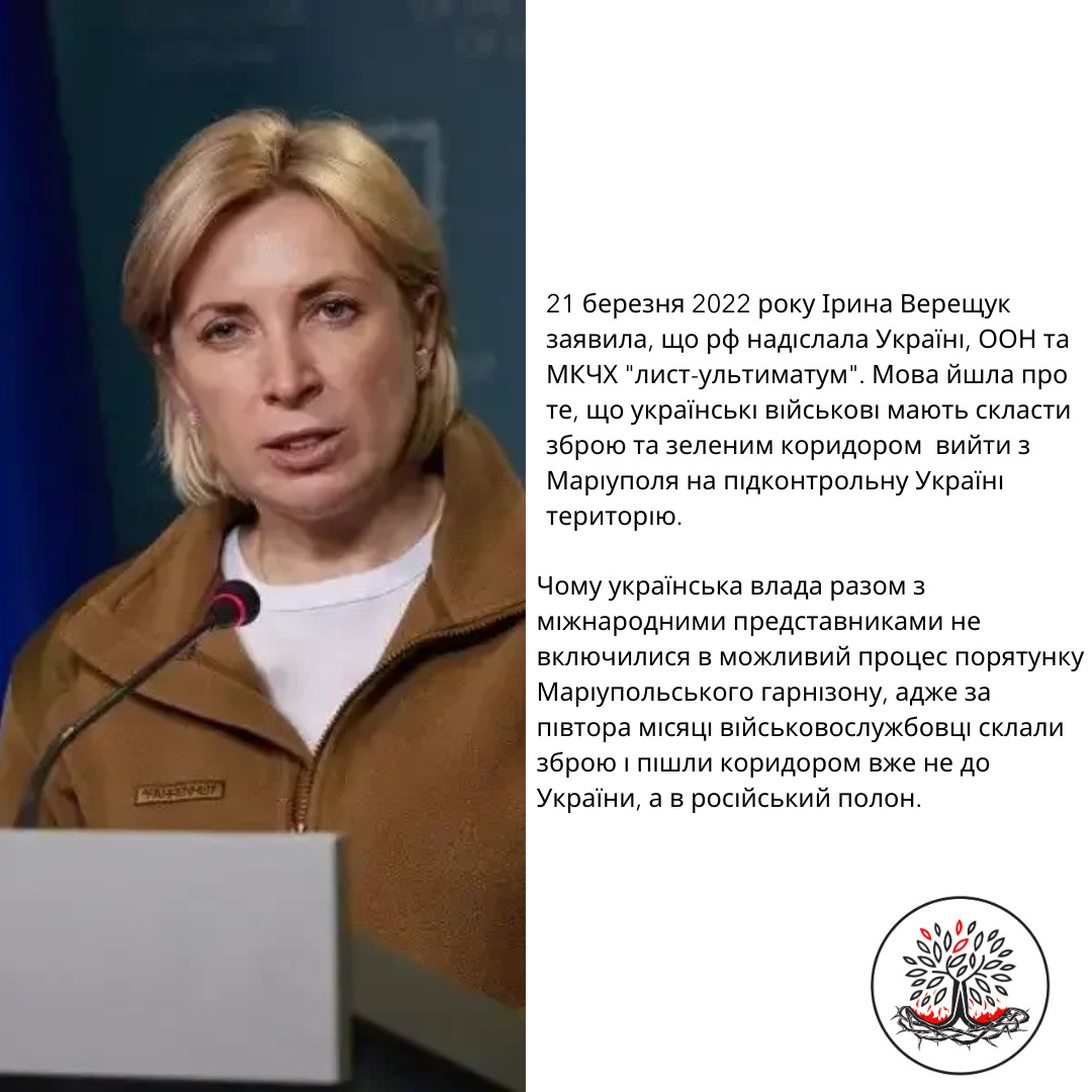 Повернемося в події березня 2022 року року. На той час Маріуполь вже перебував у повному оточенні. Саме 21 березня від імені влади Ірина Верещук заявила, що міноборони рф надіслали українській стороні «лист-ультиматум». За словами Верещук, рф пропонувала, щоб українські військовослужбовці склали зброю та зеленим коридором вийшли на підконтрольну Україні територію після чого місто зможуть покинути цивільні. Такі самі листи були направлені представникам ООН та МКЧХ. Пані Ірина публічно заявила, що українські військовослужбовці стоятимуть до останнього і пропозиція рф відхилена. І тут знову ж таки виникає питання, чому українська влада разом з міжнародними представниками не включилися в можливий процес порятунку Маріупольського гарнізону, адже за півтора місяці військовослужбовці склали зброю і пішли коридором вже не до України, а в російський полон.