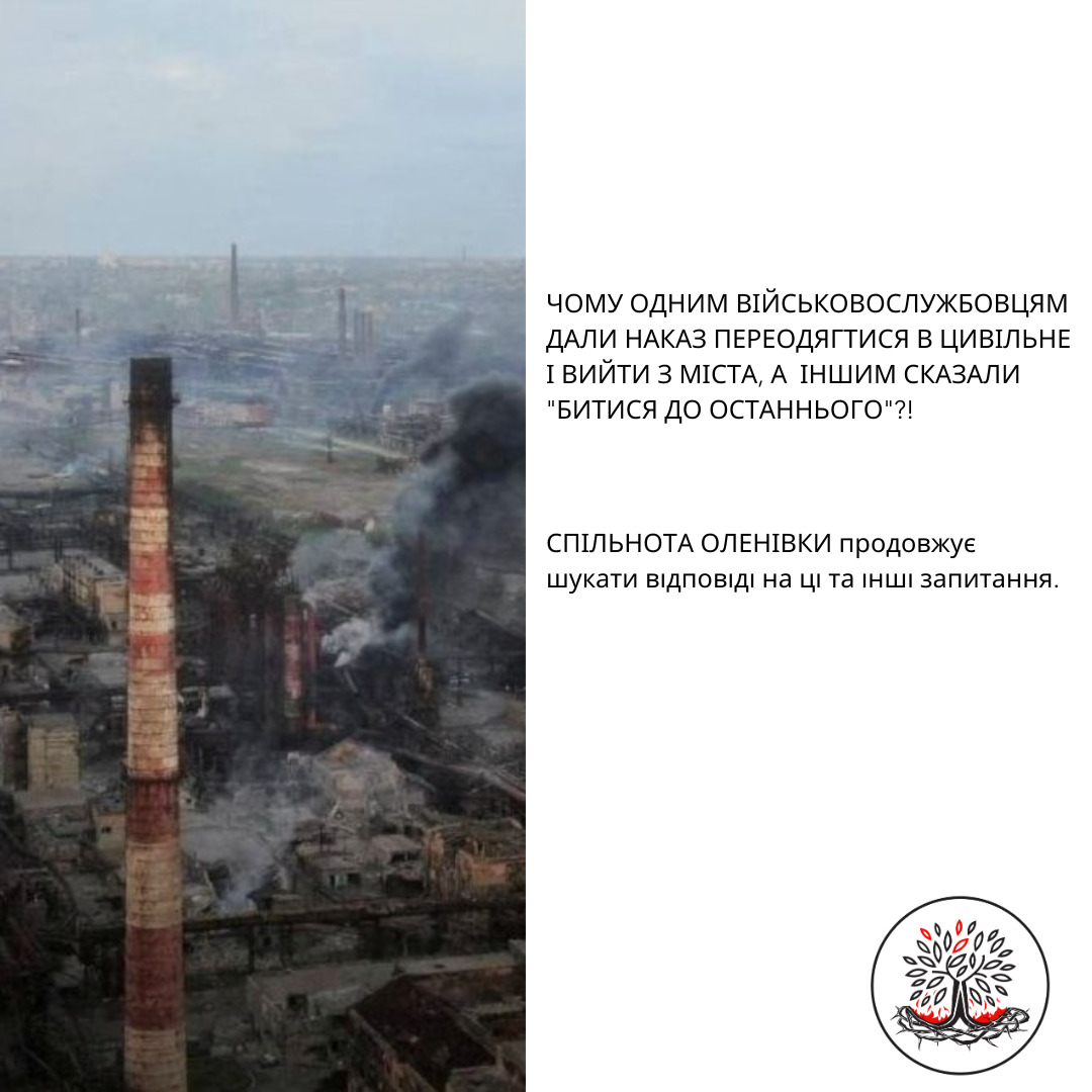 Нагадуємо ГО «Спільнота Оленівки» перша та єдина на сьогодні ініціювала проведення пресконференції з президентом України та всіма учасниками перемовин щодо виводу військовослужбовців з Азовсталі в полон. Ми, родини військовополонених, постраждалих під час теракту в Оленівці, хочемо говорити з президентом України Володимиром Зеленським про створення окремої перемовної групи задля порятунку всього Маріупольського гарнізону. На сьогоднішні серед усіх звільнених з рф немає навіть і половини людей, які виходили в полон за наказом.