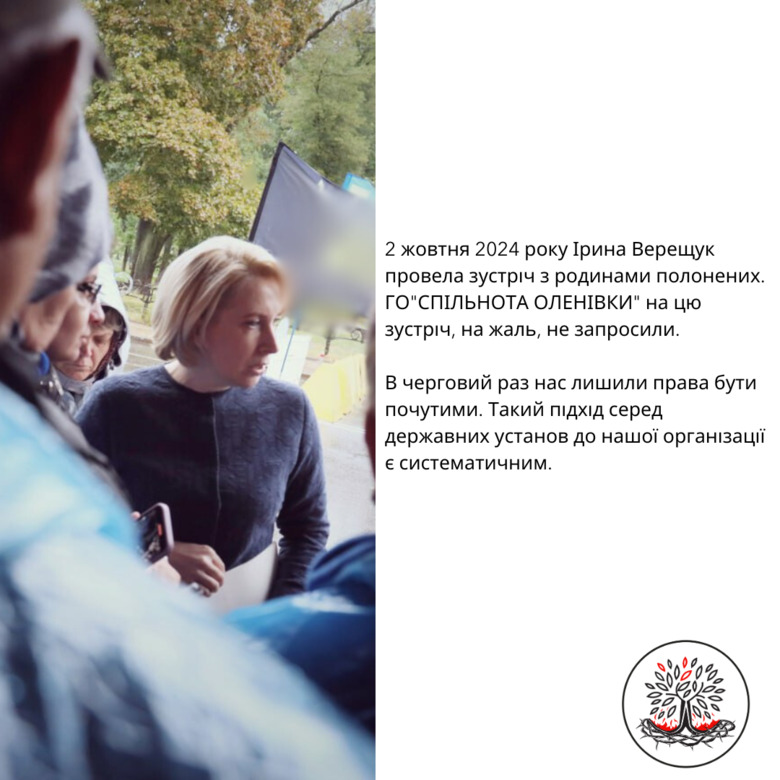 Відомо, що 2 жовтня 2024 року Ірина Верещук зустрілася з родинами військовополонених. Вона наголосила на тому, що Координаційний штаб з питань поводження з військовополоненими має покращити комунікацію з родинами. Представників нашої ГО «Спільнота Оленівки» на цю зустріч, на жаль, не запросили. Тим самим лишили нас права бути почутими. 5 квітня 2024 року ми просили повторну зустріч з Андрієм Єрмаком, лист було перенапрвлено до Координаційного штабу з питань поводження з військовополоненими. А тепер по факту вийшло, що відбулася зустріч з заступницею Андрія Борисовича, а нашу спільноту не запросили.