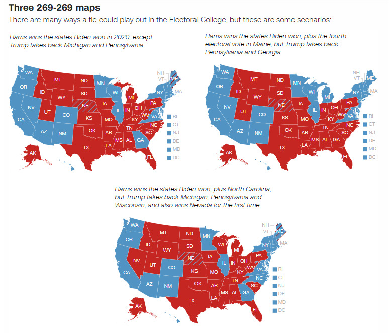 Я певен, що це нічия. Так, є три реалістичні комбінації голосувань в окремих штатах, при яких жоден кандидат не здобуває необхідні 270 голосів виборців, а обоє здобувають по 269. Що тоді?