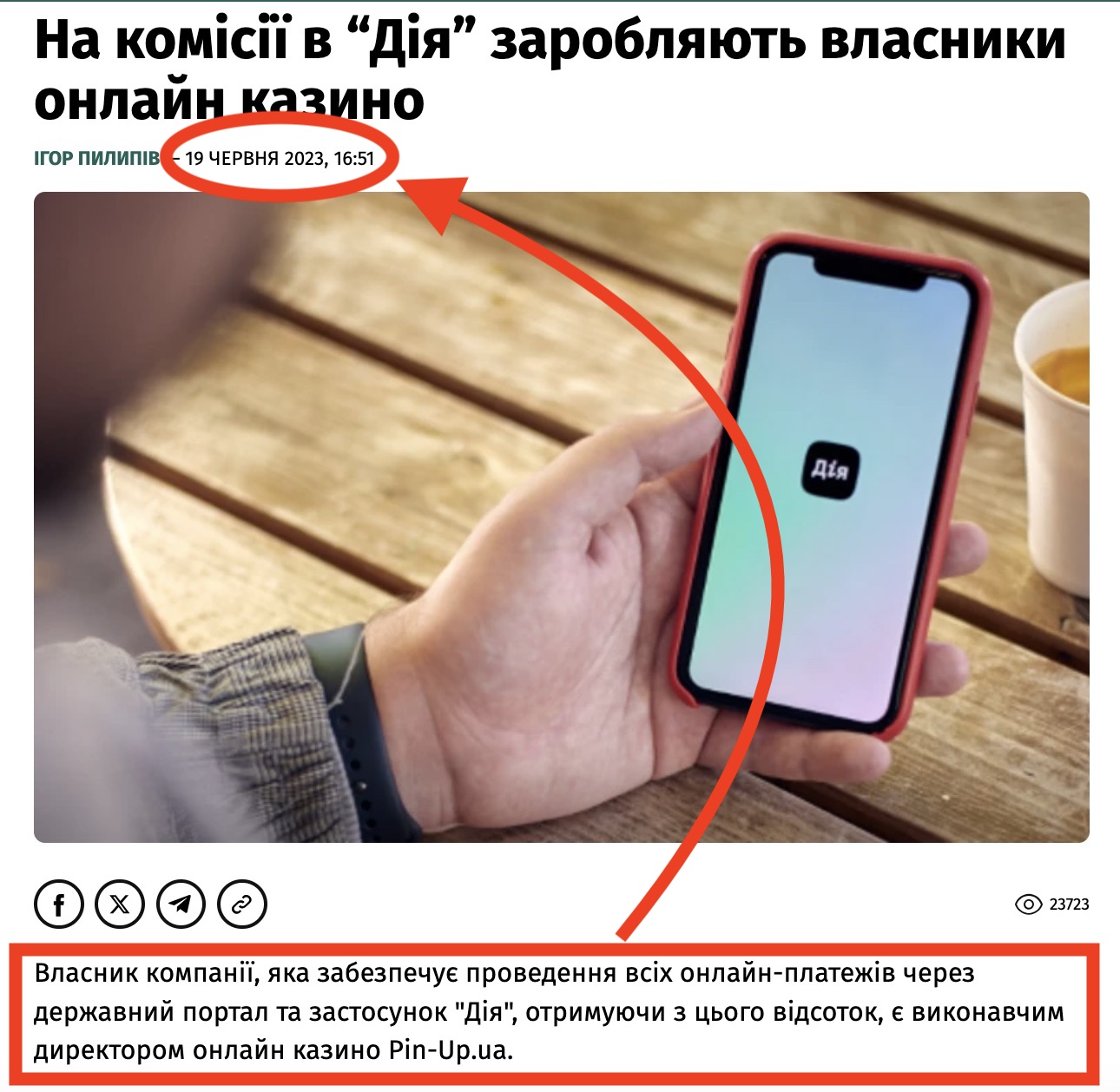 Ось цитата зі статті від 19 червня 2023: “Власник компанії, яка забезпечує проведення всіх онлайн-платежів через державний портал та застосунок "Дія", отримуючи з цього відсоток, є виконавчим директором онлайн казино Pin-Up.ua.”