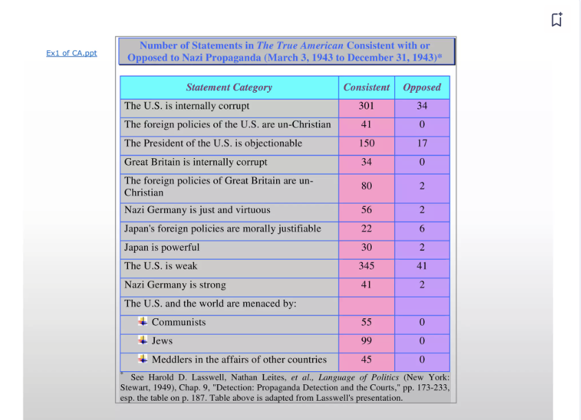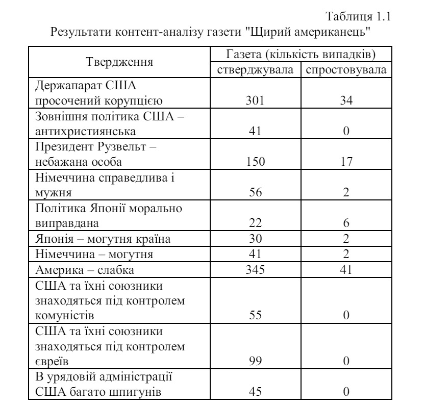 Посилається шановне панство й безпосередньо на роботу групи авторів на чолі з Лассвелом Language of Politics (1949), і жодної «фашистської Німеччини» у них нема, як і наявного в першоджерелі «nazi». Утім через це я б і не переймалася. А проте таблиця з результатами контент-аналізу, наведена в монографії для прикладу, відрізняється від оприлюдненої у першоджерелі. З нею взагалі якась магія відбувається.
