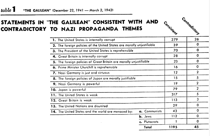 У доступному в онлайні виданні 1949 року наведено результати аналізу американської періодики, зробленого задля підсилення позиції обвинувачів у судах. Науковці мусили виявити антиамериканську (пронацистську) пропаганду, аби можна було аргументовано її припинити. У списку видань, серед інших, такий собі «Галілеянин» (The Galilean). Дослідники з’ясували, що у матеріалах, оприлюднених з грудня 1941-го до березня 1942-го (це 9 чисел), наявні щонайменше 1195 тверджень, які відповідають темам нацистської пропаганди, і тільки 45 — таких, що суперечать їй. Серед перших тверджень ((готуйтесь, є дещо невловимо знайоме)):
