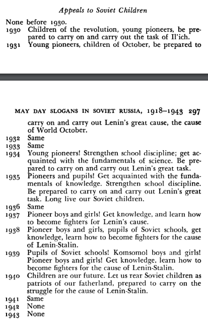 PS У Лассвела та Лейтеса наведено просто неперевершений контент-аналіз радянських May Day слоганів 1918–1943 років. Особливо впало в око те, що до 1930-го до теми дітей взагалі не апелювали, а відтоді й до 1941-го «дітей Жовтня» закликають готуватися «продовжувати боротьбу за справу Леніна».