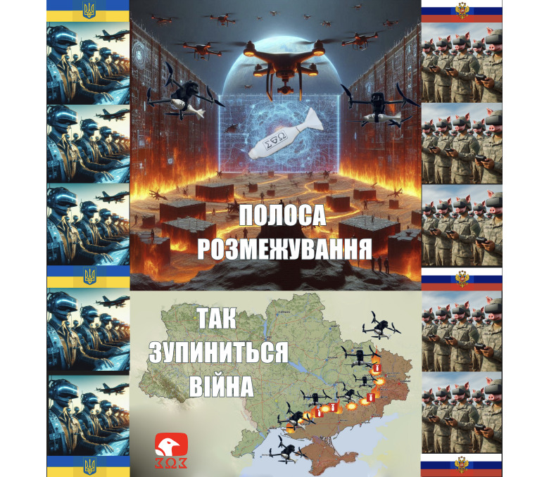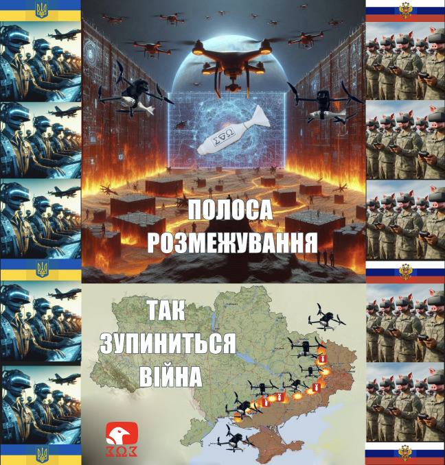 30-40 км вогняна полоса розмежування між двух віртуальних стін дронів, яка буде повністю під ударами дронів з обох сторін і де не проповзе ні одна істота. 1 млн пілотів дронів з 1 млн дронів будуть утримувати цю полосу. І періодично обмінюватись діпстрайками глубокими ударами. Того всі громадяни України мають стати пілотами дронів.