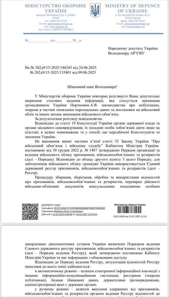 Я зробив запит на міноборони щодо мобілізаційного статусу проросійського куратора правової мафії. Відповідь цитую: "інформація про громадянина Портнова А.В не містить ознак предмету суспільного інтересу. З огляду на зазначене, надати запитувану інформацію про громадянина Портнова А.В. не вбачається за можливе."