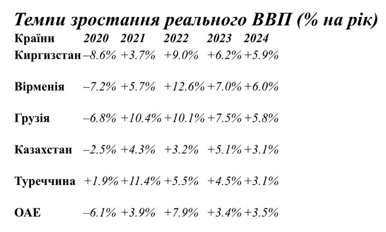 Казахстан і ОАЕ — винятки. Вони мають природні ресурси, диверсифікований експорт і профіцити. Їхнє зростання має більше структурного характеру.