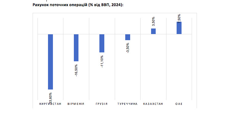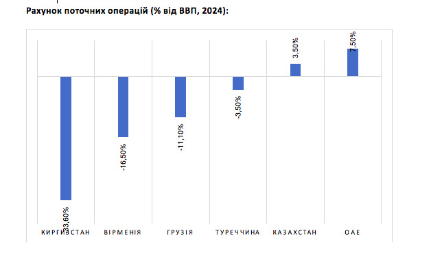 • Казахстан і ОАЕ — винятки: торговельний профіцит і стійкий експорт, завдяки нафті, газу та металам.