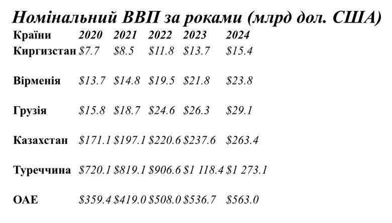 Ці показники демонструють, що найбільш вибухове зростання після 2022 року спостерігається у Вірменії, Киргизстані, Грузії — саме тих країнах, що межують з росією та активно залучені до неформального реекспорту.У Казахстану зростання помірне, але стабільне.Туреччина і ОАЕ теж демонструють високу динаміку, але структура зростання інша — це великі диверсифіковані економіки.