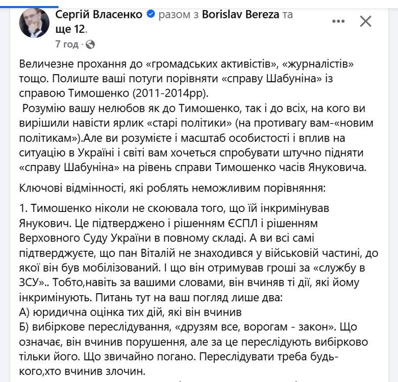 Зважаючи на те, що стосунки пана Власенка з пані Тимошенко настільки давні й тісні, що їх можна вже назвати навіть родинними, йому, схоже, передалася звичка патологічної брехливості, характерної для всієї родини пані Тимошенко. Якщо пан Власенко та пані Тимошенко заперечуватимуть використання слова «патологія», бо це стосується вже медичного стану їхньої поведінки, тому не можу його використовувати, я його приберу. Але лише його.