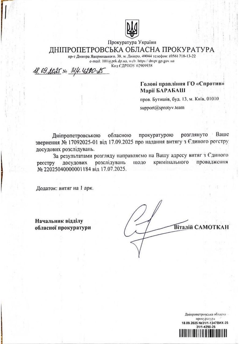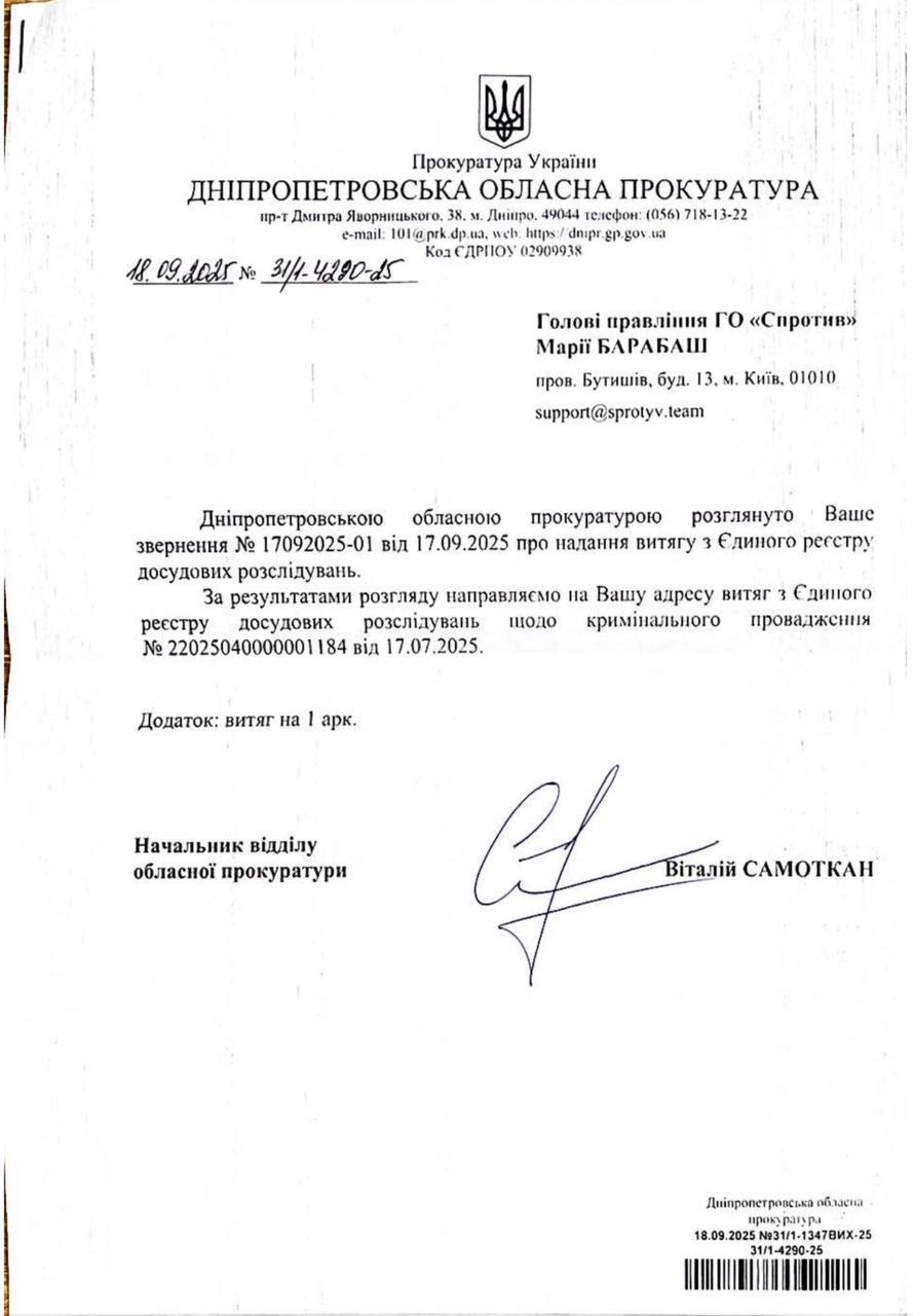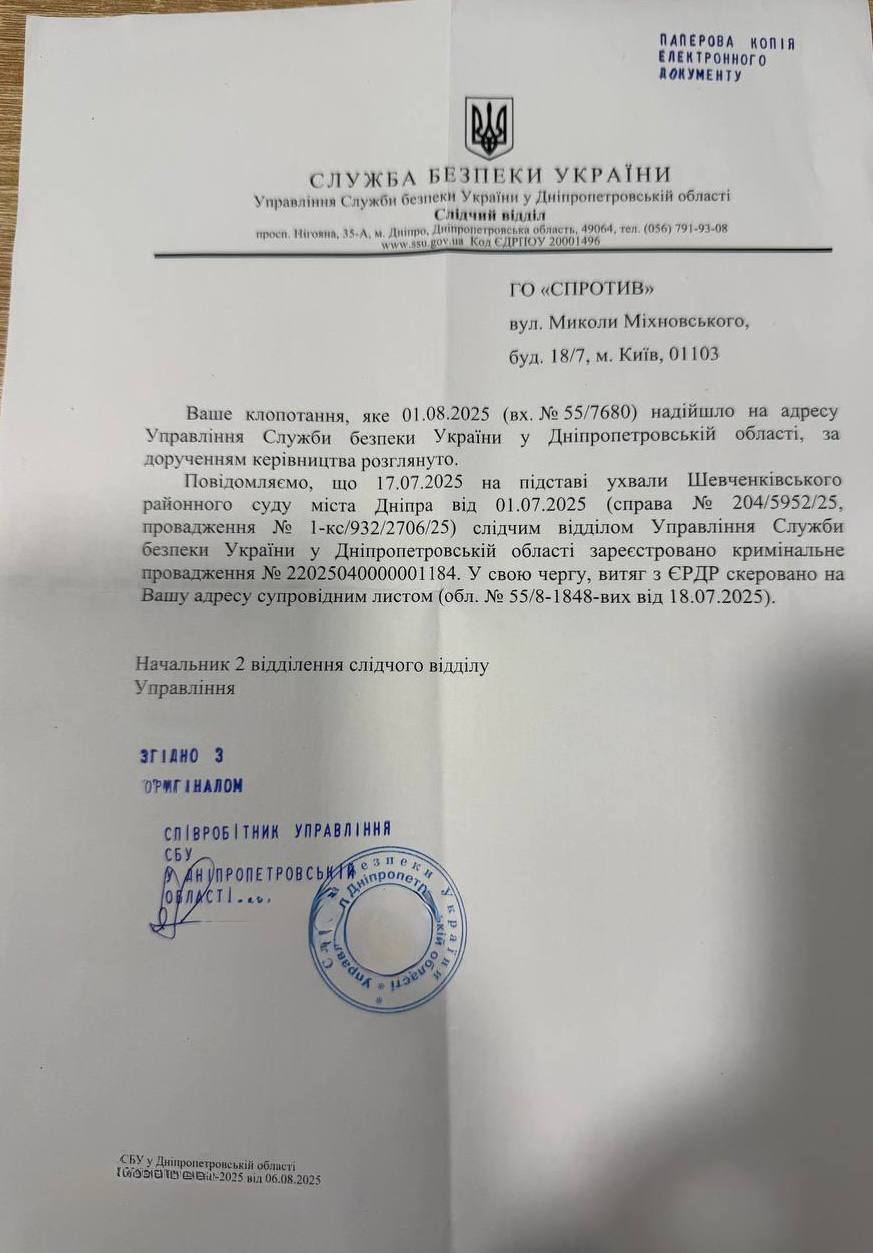 Тому 25 лютого та 6 березня 2025 року керівниця ГО «СПРОТИВ» Марія Барабаш подала скарги на бездіяльність УСБУ у Дніпропетровській області щодо невнесення відомостей про кримінальне правопорушення.
