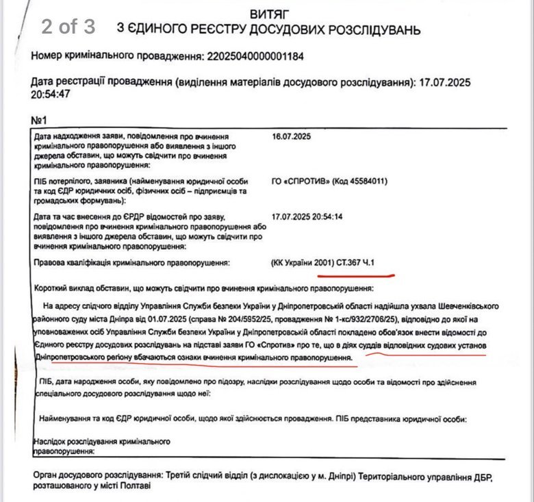 10 лютого 2025 року громадська організація «СПРОТИВ» подала до Шевченківського районного суду м. Дніпра заяву про вчинення кримінального правопорушення суддею Оксаною Лаченковою та іншими суддями.