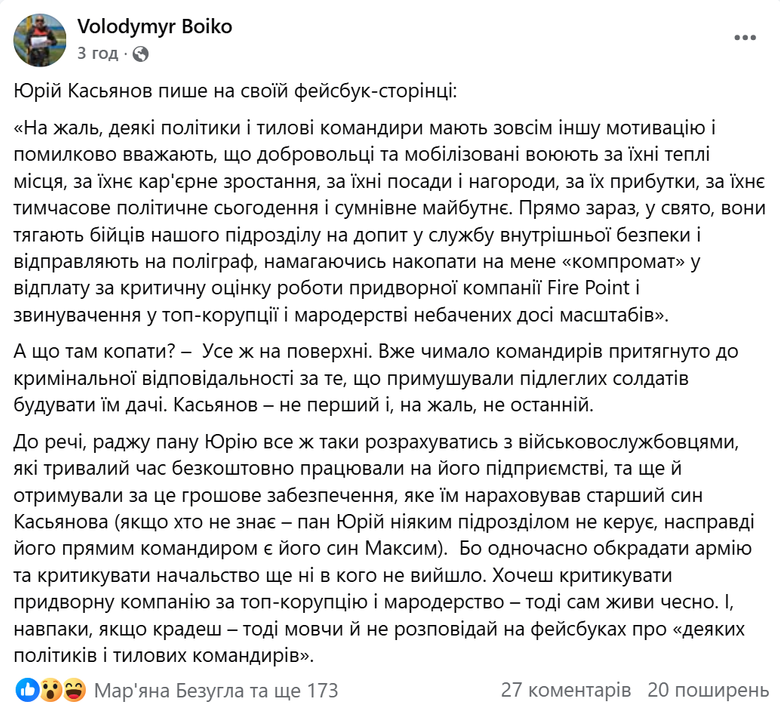 Відповім просто - повна брехня. Повна. Абсолютна. Навпаки - моє невеличке сімейне підприємство з початку війни забезпечує наш підрозділ усім необхідним. Ніколи військовослужбовці не працювали на моєму підприємстві. Ніколи!