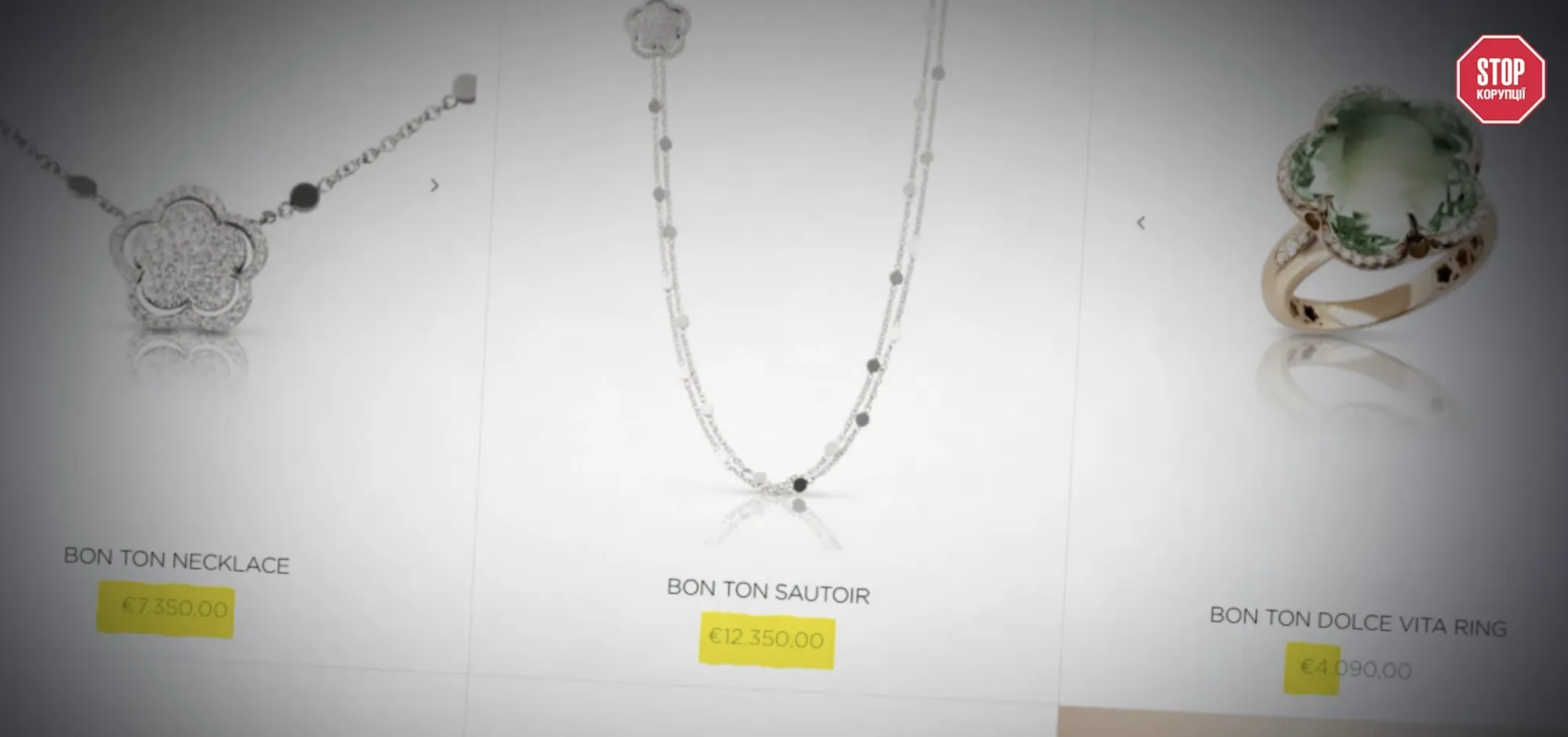 Дружина посадовця задекларувала понад 10 колекцій ювелірних виробів. Серед них — прикраси від Паскаля Бруні вартістю понад 500 тисяч гривень і вироби бренду Carrera y Carrera — щонайменше на мільйон. Також у власності родини — 15 люксових годинників Ulysse Nardin і Chopard, інкрустованих діамантами.