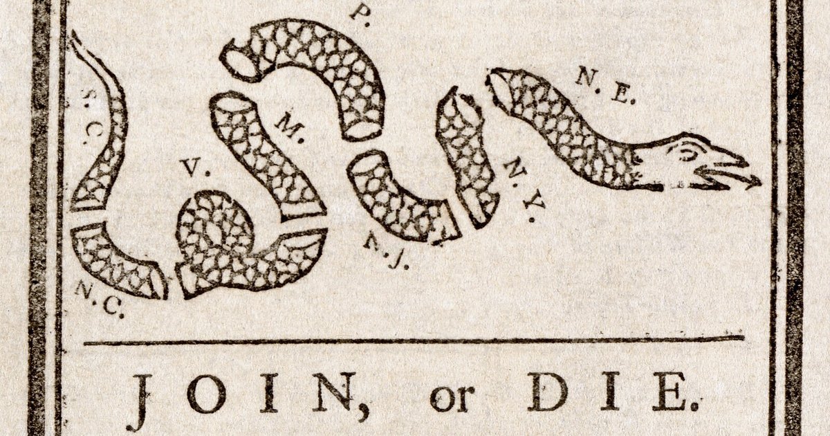 Об’єднатися або померти - цим гаслом Бенджамін Франклін закликав до єдності Американські колонії під час Великої війни 1754-1763 років. Об’єднатися або померти - це те, що світить Україні сьогодні.