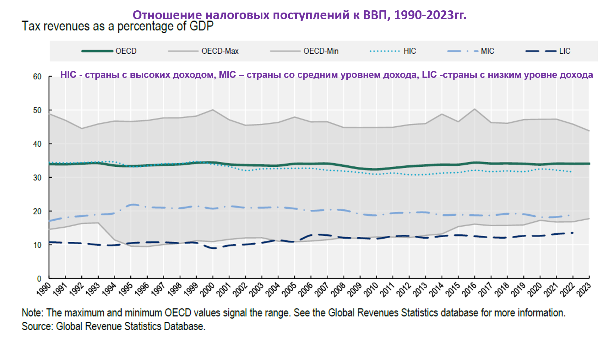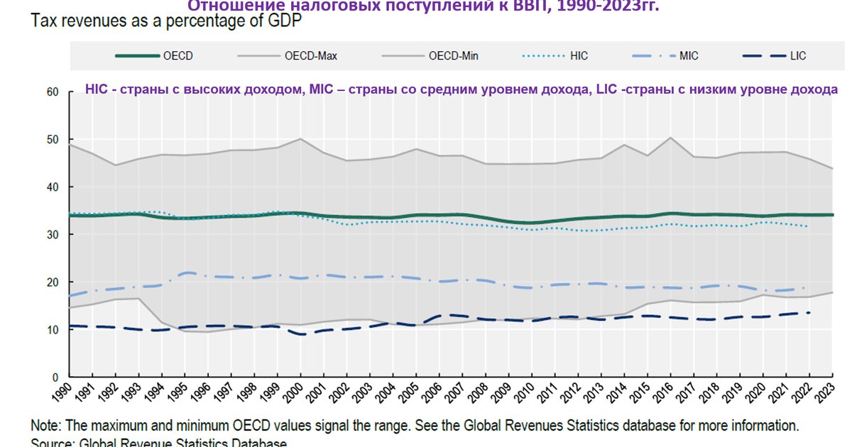 В 2023г. в странах ОЭСР средняя налоговая нагрузка составила 33,9% - меньше Украины. В Пакистане она составила 10,5% ВВП, в Индонезии 12,0% ВВП, во Вьетнаме – 16,8% ВВП, в Казахстане – 19,5% ВВП, Ю. Корее – 28,9% ВВП, Австралии – 29,4% ВВП, Японии – 34,4% ВВП, в Чили – 20,6% ВВП, Израиле 29,8% ВВП, Мексике 17,7% ВВП, Турции – 23,5% ВВП, Бразилия – 32,0% ВВП.