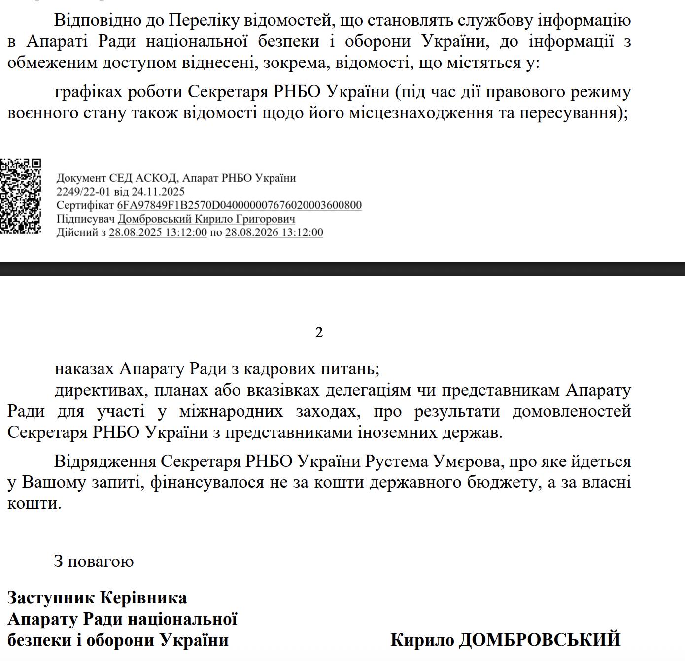 У відповіді на наш запит – надати копію наказу про відрядження Рустема Умєрова від 11 листопада та склад делегації – в РНБО назвали таку інформацію "з обмеженим доступом". Ну добре, що хоч повідомили, що саме відрядження фінансувалося не за державні гроші.