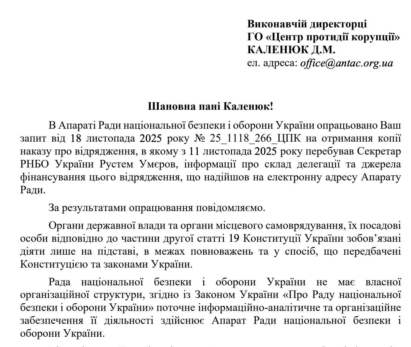 Для уникнення різних інтерпретацій подій, Апарат РНБО має надати офіційну інформацію з копією наказу про відрядження про те з ким, куди саме, для яких визначених державою цілей і за які гроші їздив у закордонне відрядження Рустем Умєров від імені України від 11 листопада 2025 року.