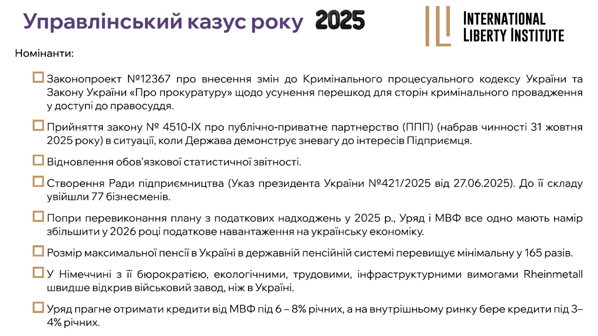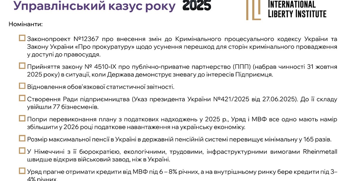 Украина никогда не была капиталистической страной. Украинцы ни дня, ни месяца – никогда не жили в режиме личной и экономической свободы. Ни один состав политиков (президент, парламент, правительство) не предложил украинцам модель малого государства и большого общества, чтобы главным в экономике был Человек, а не Чиновник. Поэтому логика действий, решений, оценок украинского Правительства отличается от рыночного, капиталистического, нацеленного на Свободу. VIP-распорядители чужого максимизируют полезность, ценность и выгоду себе лично, своим начальникам/спонсорам, а также VIP-потребителям чужого, которых делают фаворитами государственных коммерческих программ и проектов. То, что является «управленческим казусом» с точки зрения теории и практики Свободы, с позиции представленного нами декалога показателей качественного государственного управления, для них является нормой поведения, потому что они работают по схеме «приватизация прибыли – национализация убытков». Их не интересуют страновые издержки, в том числе издержки упущенной выгоды. Их не беспокоит доступность товаров/услуг для медианного украинца, уровень инфляции, стоимость кредита или доля расходов домашнего хозяйства на питание. Им всё равно, какие будут темпы роста экономики и какой будет дыра в бюджете. Их не интересует создание новых высокопроизводительных рабочих мест частными инвесторами. Им принципиально важно оставаться и двигаться вверх в иерархии 3% VIP-распорядителей и потребителей чужого. Наш список управленческих казусов Украины в 2025 году подтверждает этот вывод.