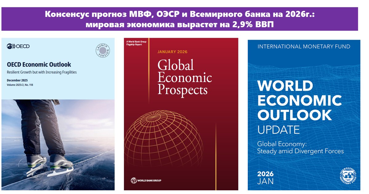 Вот что мы имеем по состоянию на январь 2026 года. МВФ в своём январском прогнозе на 2026 год. оценивает рост мировой экономики на 3,3%. Это столько же, сколько ожидается в 2025г. Именно 3,3% ВВП был рост реального мирового ВВП в 2024г.