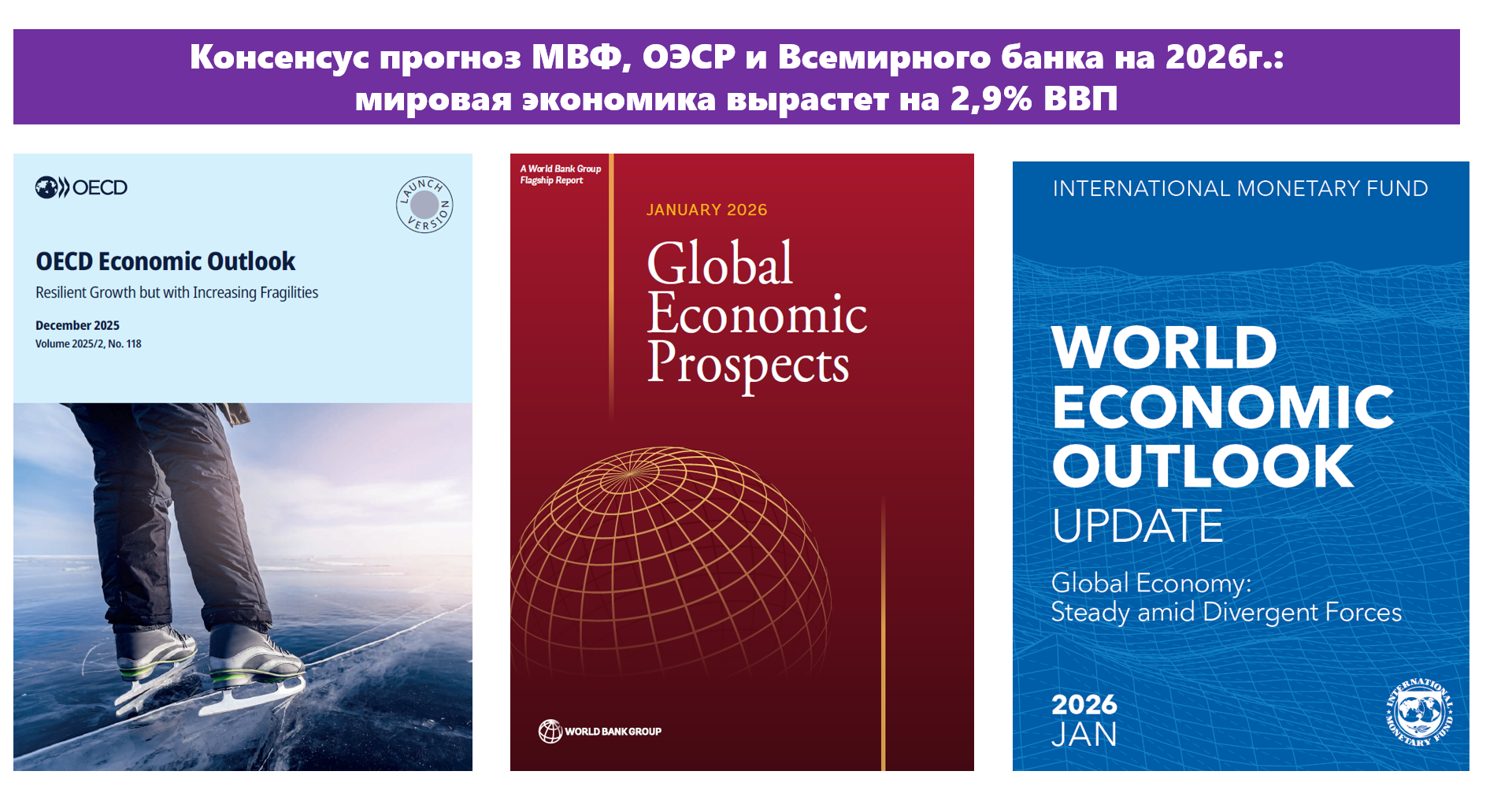 Возьмём данные ещё одной международной организации, которая даёт прогнозы по мировой экономике несколько раз в год. ОЭСР в докладе декабря 2025г. оценила рост ВВП мира в 2026г. на 2,9%, а в 2025г. на 3,2%. Фактические темпы роста ВВП мира в 2024г., по данным ОЭСР, составили 3,3%.