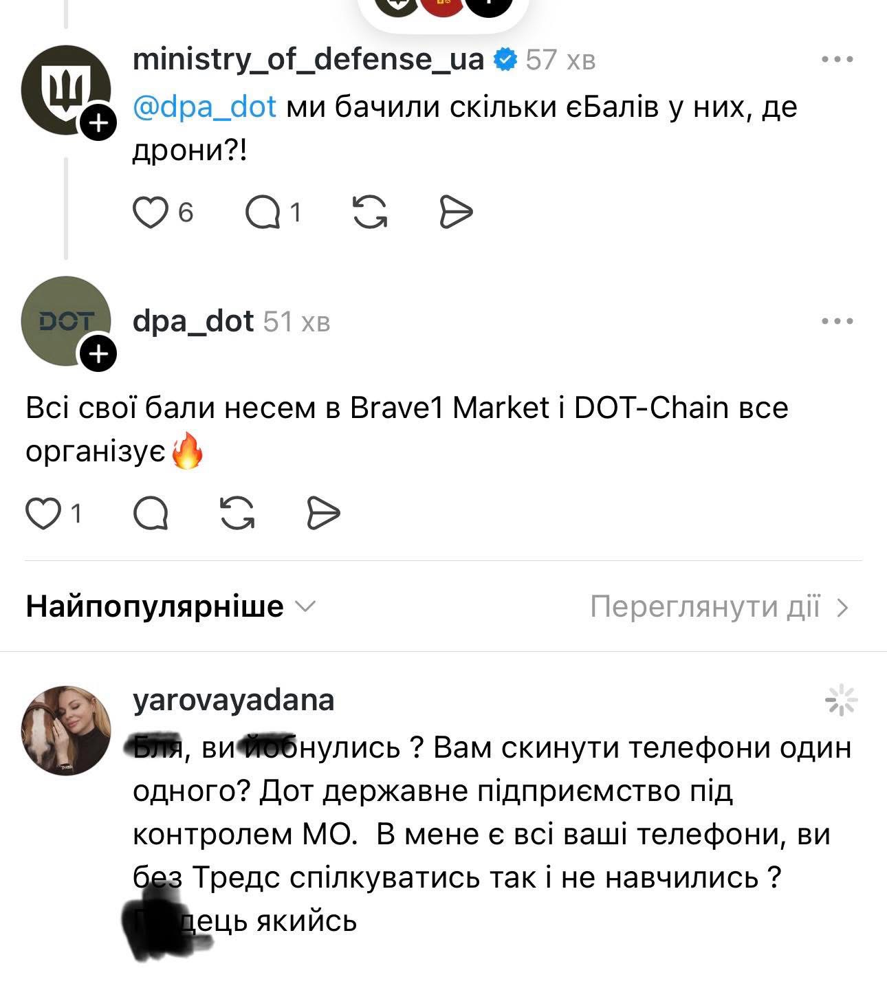 На ньому Міністерство оборони України “робить зауваження” своєму ж підприємству “Державний оператор тилу Міністерства оборони України” про відсутність дронів у якогось підрозділу - попри наявність є-балів.