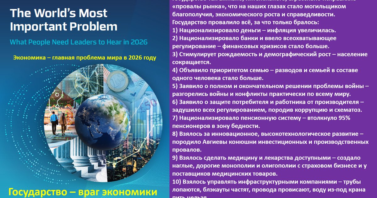 На глобальном саммите правительств (World governments summit) в Дубае (3 - 5 февраля 2026г.) для делегаций более чем 150 стран социологи Gallup представили доклад «Самая важная проблема мира. Что должны услышать лидеры от людей в 2026 году» (The World’s Most Important Problem. What People Need Leaders to Hear in 2026). Репрезентативный опрос взрослого населения (15 лет +) был проведён в 107 странах мира. Самой большой проблемой для людей в своих станах из 12 опций стала экономика. 23% (медиана) в 107 странах указали именно на неё. Под понятием «экономика» имеется в виду стандарты жизни, высокие цены, низкие зарплаты. Экономика – самая большая проблема в 71-й из 107 стран, где проводился опрос. Вероятность того, что люди укажут на экономику, как на основную проблему, гораздо выше в странах с низким доходом. В странах с высоким доходом таких 21%, в станах с доходом выше среднего 31%, ниже среднего – 36%, а в странах с низким доходом – 38%.
