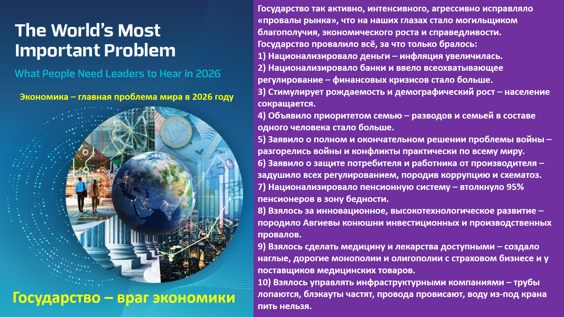 Государство так активно, интенсивного, агрессивно исправляло «провалы рынка», что на наших глазах стало могильщиком благополучия, экономического роста и справедливости. Государство провалило всё, за что только бралось: