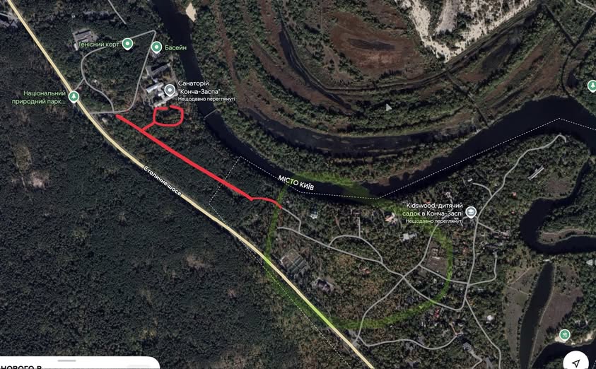 А зараз співставляємо це: виявляється між санаторієм, державними дачами та резиденцією Президента є дорога. Навіть дві через ліс 🌳. І саме в санаторії знаходяться так звані евакуаційні ворота, які зʼєднують держдачі та санаторій.