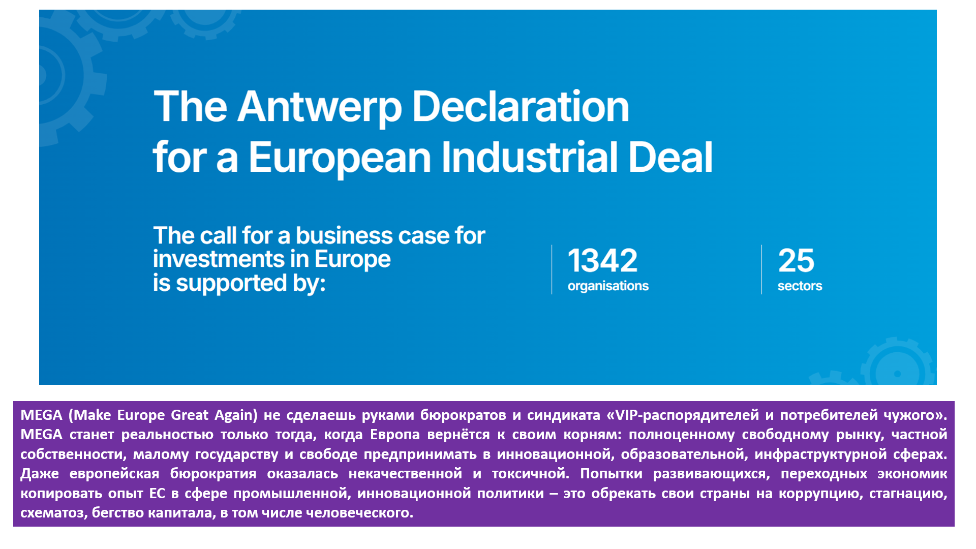 MEGA (Make Europe Great Again) не сделаешь руками бюрократов и синдиката «VIP-распорядителей и потребителей чужого». MEGA станет реальностью только тогда, когда Европа вернётся к своим корням: полноценному свободному рынку, частной собственности, малому государству и свободе предпринимать в инновационной, образовательной, инфраструктурной сферах. Даже европейская бюрократия оказалась некачественной и токсичной. Попытки развивающихся, переходных экономик копировать опыт ЕС в сфере промышленной, инновационной политики – это обрекать свои страны на коррупцию, стагнацию, схематоз, бегство капитала, в том числе человеческого.