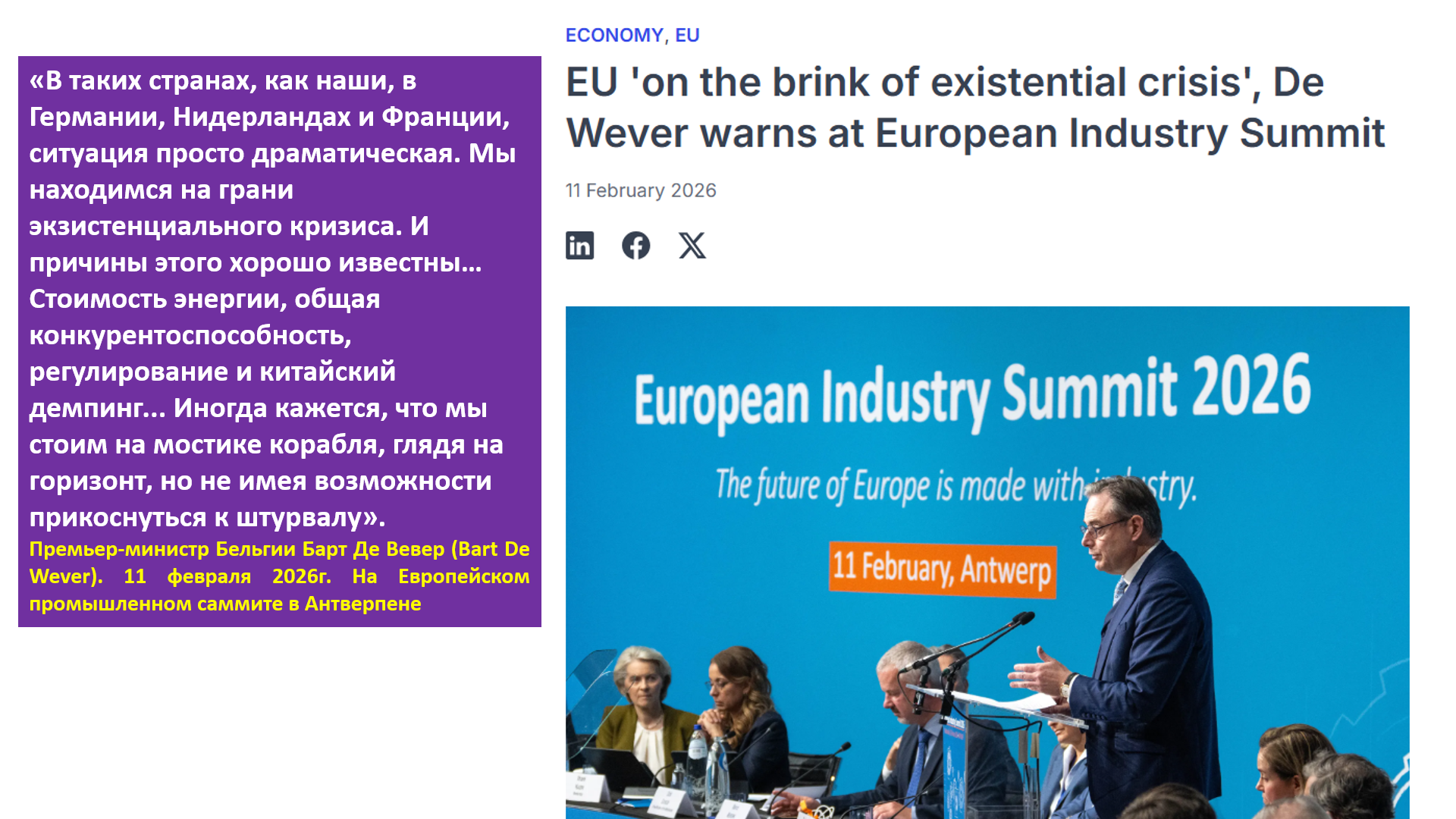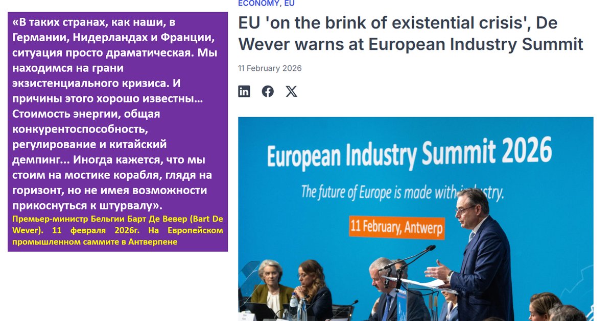 О том, успех или провал промышленной и экономической политики ЕС, давайте судить по оценкам самих лидеров стран ЕС и представителей промышленности. Эти мнения были высказаны на Европейском промышленном саммите в Антверпене 11 февраля 2026г. Его итоги подводил премьер-министр Бельгии Барт Де Вевер (Bart De Wever). Вот несколько его высказываний: «Мы находимся на грани экзистенциального кризиса».