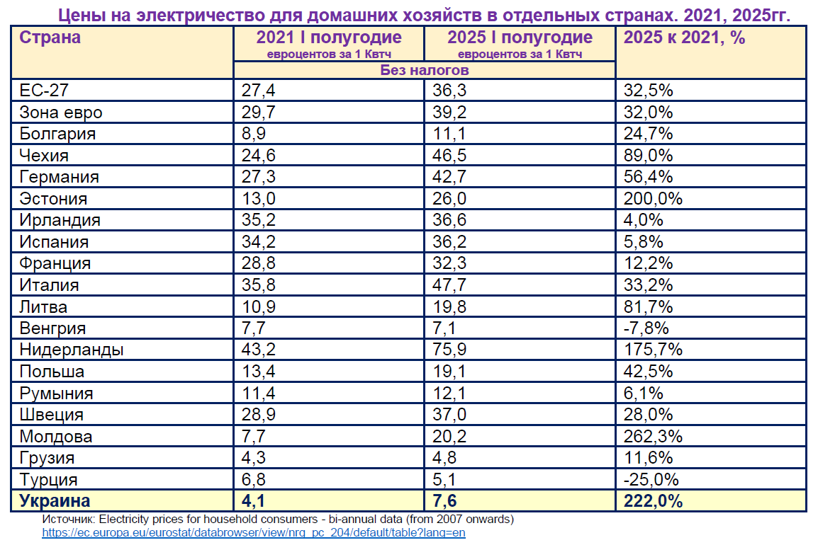 В I полугодии 2025г. самые высокие цены 1 квт/ч электроэнергии для домашних хозяйств были в Нидерландах (75,9 €-центов), на Кипре (48 €-центов), Италии (47,7 евроцентов), Чехии (46,5 евроцентов, Германии (42,7 €-центов). Самая дешёвая электроэнергия в ЕС была в Румынии (12,1 €-центов), Венгрии (7,1 €-центов), Болгарии (11,1 €-центов) и Польше (19,1 €-центов). Цена 1квт/ч электроэнергии в Украине в 2025г. для домашних хозяйств в 4,8 раза ниже, чем в среднем в ЕС-27, в 5,2 раза ниже, чем в странах зоны евро. Даже у нашей соседки Польши цены выше в 2,5 раза, чем в Украине. С учётом налогов цена 1квт/ч электроэнергии в Украине в I половине 2025г. была в 5,1 раз дешевле, чем в среднем по ЕС и в 5,4 раза дешевле, чем в странах зоны евро. Если бы в ЕС был бы полноценный рынок электроэнергии, то даже с учётом технологических, материально-технических ограничений (сети, трансформаторы и т.д.), разница в ценах не была бы 3 - 5 раз, а гораздо меньше. Такие высокие цены на электроэнергию – это защита крупного бизнеса в этом секторе экономики. Это результат номенклатурно-коммерческого сговора. После нашей победы Украина, если бы она провела полноценную энергетическую реформу, она могла бы стать крупным импортёром электроэнергии для Европы. Это было бы благом как для нас, так и для европейских потребителей, которые бы экономили своих денежных ресурсов существенную часть своего домашнего бюджета. Это было бы несомненным благом для европейской промышленности, особенно в свете бурного внедрения искусственного интеллекта, современных технологий. Дело за «малым» - убедить дисижнмейкеров в Брюсселе и столицах стран ЕС создать, наконец, полноценный свободный рынок электроэнергии во всей Европе. Если же Евросоюз затянет, заманит Украину в жёсткие рамки своей энергетической, экологической, промышленной политики, то результат для экономики будет lose-lose, т. е. проиграют 97% потребителей ЕС + Украина, а выиграют 3% энергобаронов и членов синдиката «VIP-распорядителей и потребителей чужого». Это путь к потере конкурентоспособности, деиндустриализации, истощению духа предпринимательства.