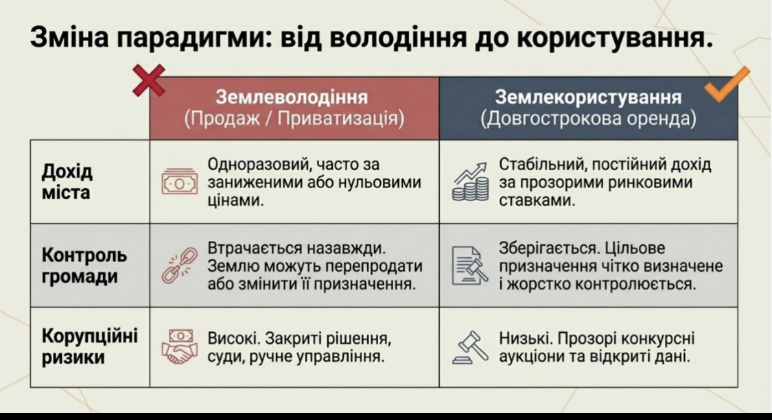 Йдеться про те, щоб передавати землю в довгострокову оренду на прозорих конкурсних умовах, де плата за користування буде ринковою, а цільове призначення – чітко визначеним і контрольованим. Такий підхід дозволить місту отримувати стабільний дохід, залучати відповідальних інвесторів, але при цьому збереже землю як стратегічний ресурс громади, який не можна скупити, перепродати або вивести з-під контролю містян.
