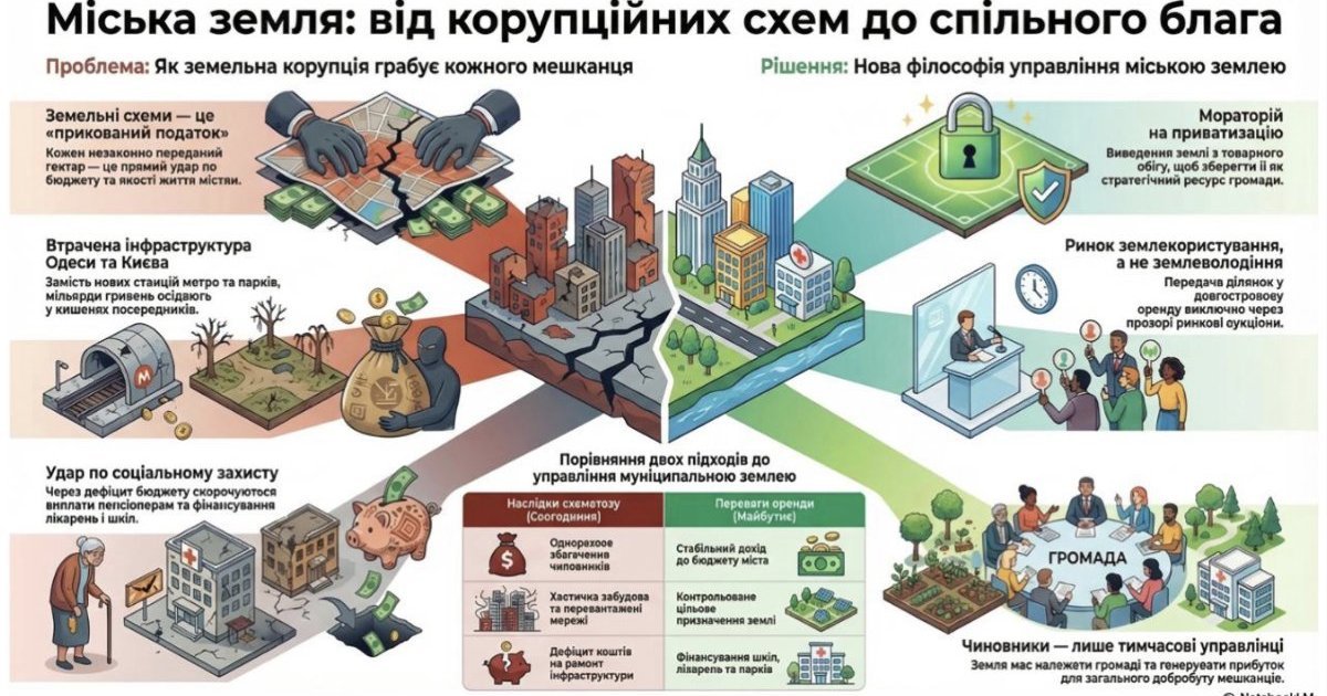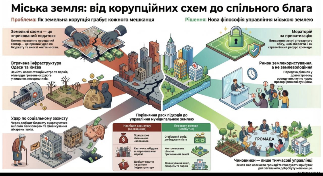 Міська земля за своєю суттю належить громаді. Чиновники не є її власниками – вони лише тимчасові управлінці, яким довірено розпоряджатися цим активом в інтересах людей. І наше спільне завдання – зробити так, щоб кожен клаптик землі працював не на кишеню окремих ділків, а на розвиток міста і добробут кожного його жителя. Бо земельна корупція – це не просто зловживання владою. Це пряме пограбування міста і його мешканців. І зупинити це пограбування можна лише тоді, коли земля перестане бути товаром і стане спільним благом.