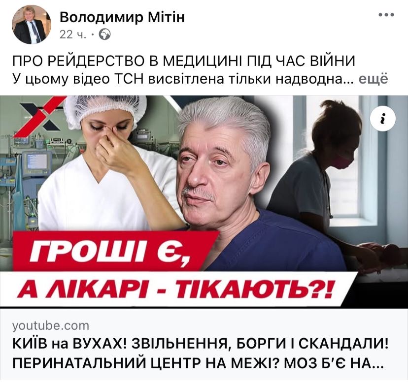 Окремі факти також викликають запитання. Зокрема, за попередніми даними, компанії, пов’язані з Володимиром Мітіним, раніше могли постачати медичне обладнання до «Перинатального центру м. Києва» за попереднього керівництва, а також брати участь у його обслуговуванні.