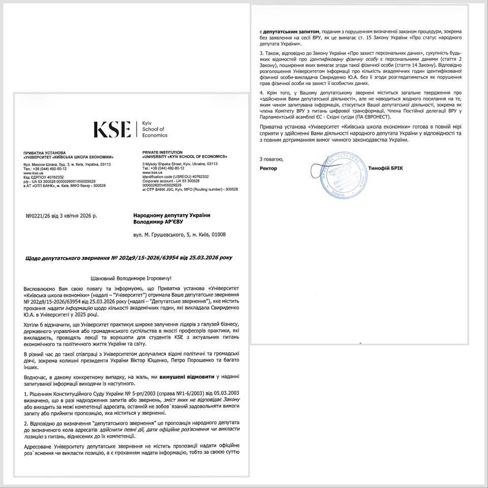Бо я отримав таку відповідь від ректора Київської Школи Економіки на моє просте по суті депутатське звернення: скільки академічних годин занять мала прем’єр-міністр Свириденко в КШЕ протягом 2025 року? Дуже просте питання. Інтерес є суспільно важливим і небезпідставним, бо прем’єрка задекларувала 3 243 529 гривень доходу від ПУ "Університет "Київська Школа Економіки". Це близько 270 тисяч гривень в місяць за викладацьку роботу, що у 2,5 рази більше її зарплатні як прем’єра.