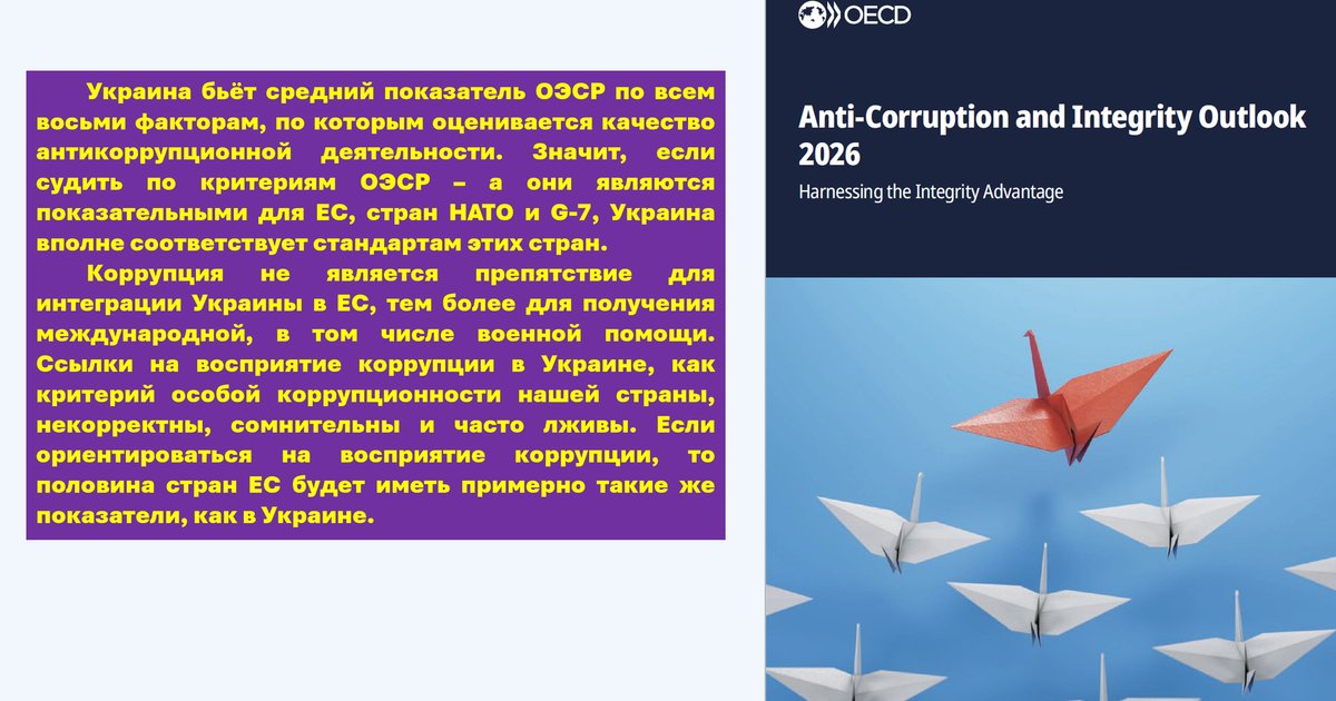Мы бьём средний показатель ОЭСР по факторам «публичная информация», «судебная добросовестность», «прокуратура», «системы дисциплинарного воздействия» (disciplinary systems). Иными словами, по всем восьми параметрам, по которым оценивается качество антикоррупционной деятельности, Украине опережает ОЭСР. Значит, если судить по критериям ОЭСР – а они являются показательными для ЕС, стран НАТО и G-7, Украина вполне соответствует стандартам этих стран. Коррупция не является препятствие для интеграции Украины в ЕС, тем более для получения международной помощи. Ссылки на восприятие коррупции в Украине, как критерий особой коррупционности нашей страны, также некорректны и сомнительны. Если ориентироваться на восприятие, то половина стран ЕС будет иметь примерно такие же показатели, как в Украине.