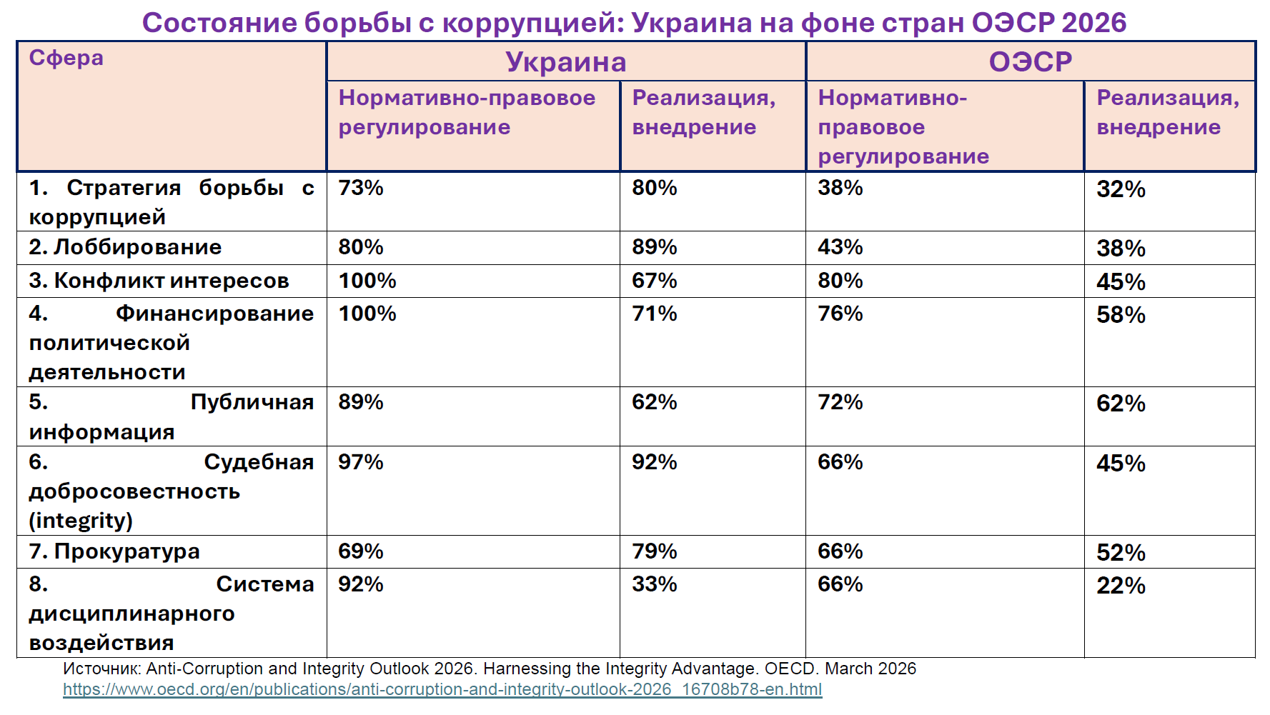 Вот сенсация, друзья. По нормативно-правовому регулированию (законодательная база для борьбы с коррупцией и обеспечения честности Правительства) Украина в 2025г. по фактору «стратегия борьбы с коррупцией» имела 73% из 100% возможных, в то время, как в странах ОЭСР в целом этот показатель составил 38%. Иными словами, показатель Украины почти в два раза лучше, чем в развитых странах мира. По имплементации стратегии борьбы с коррупцией Украина имеет 80%, а страны ОЭСР – 32%. Т. е. мы на голову бьём страны ОЭСР по этому показателю. Мы даже круче шведов. У них 53% выполнения критериев по стратегии на уровне нормативки и 50% - имплементация.