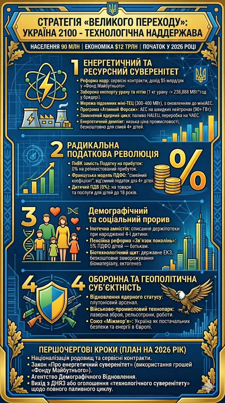 Для того щоб перетворити Україну 2026 року на технологічну наддержаву з населенням 90 мільйонів та економікою у $12 трлн до 2100 року, необхідний пакет радикальних, системних та незворотних реформ.