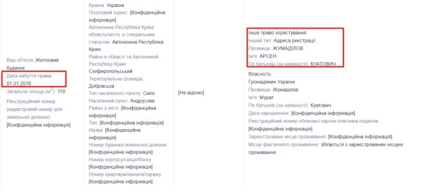 Повідомляється, що у 2018 році він набув права користування додому площею 110 м кв. в Криму, будинок купив брат - громадянин росії Мурат Жумадилов, оформляючи все через російські реєстри і подаючи документи окупаційним органам влади.