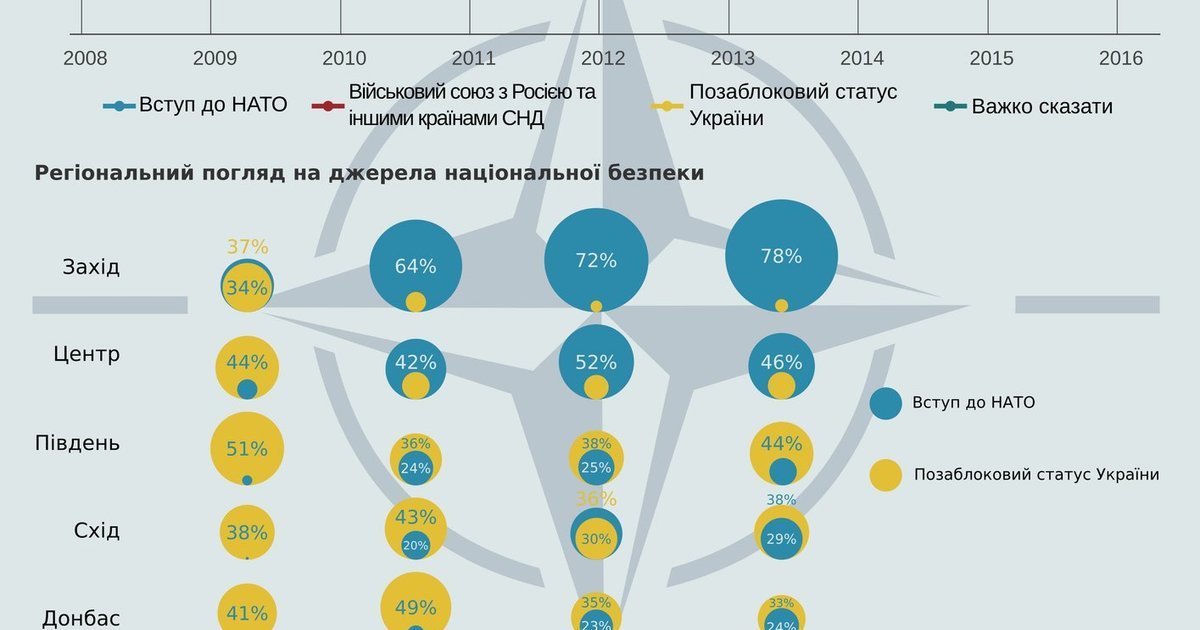 Згідно з дослідженням за останні роки суттєво змінилася і регіональна мапа підтримки НАТО. Якщо у 2012 році Захід був ледь не єдиним макрорегіоном, де відносна більшість (близько 37%) підтримувала членство в Альянсі, а інші (34%) надавали перевагу позаблоковому статусу, то вже з 2014 року відбулося зростання прихильності до НАТО в усіх макрорегіонах. Відтак, у 2016 році про НАТО, як запоруку безпеки почали говорити у Центрі України (46%), на Півдні - 19%. Але найбільш істотне зростання орієнтації на НАТО відбулося у громадській думці Сходу (29%) і Донбасу (24%).
