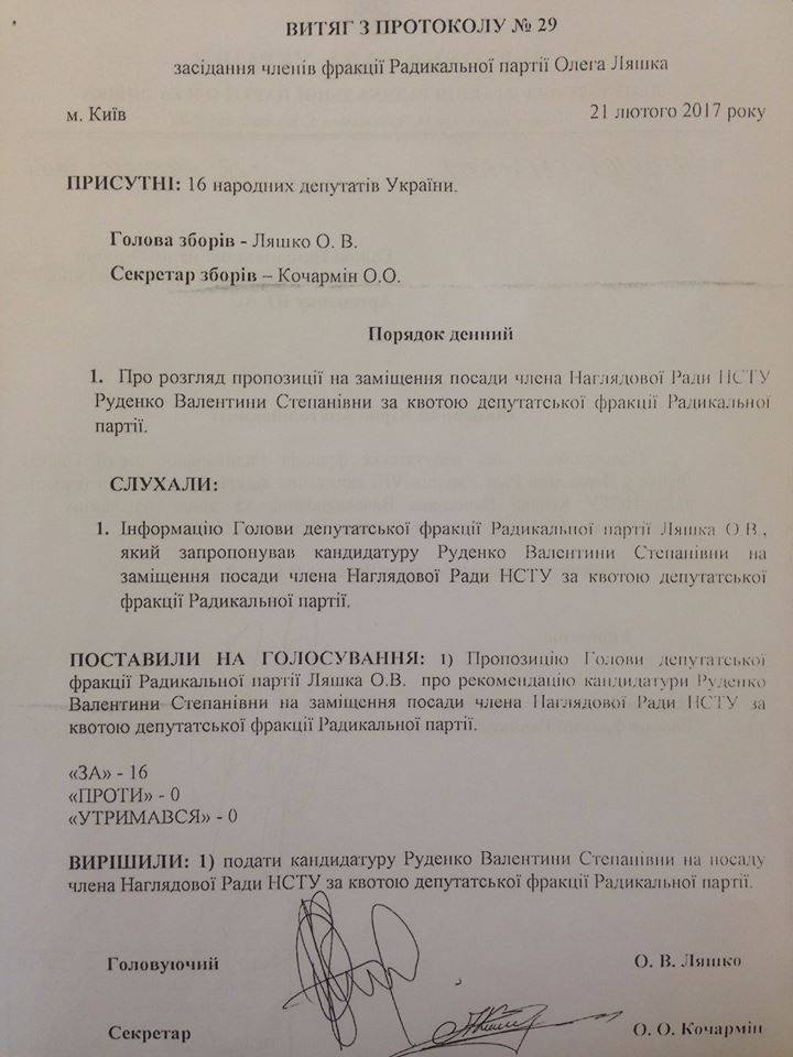 "Ось документ: підтвердження того, що фракція Олег Ляшка порушила норму закону про суспільне мовлення. Олеже Валерійовичу, у правовій державі так не роблять! Всупереч Закону про суспільне мовлення фракція РПЛ звернулася (з підписом Ляшка) до Національної ради України з питань телебачення і радіомовлення з листом про відкликання члена Наглядової ради суспільного мовлення Вячеслав Козак, делегованого його фракцією, на Валентина Руденко без ЖОДНОЇ законної підстави на це", - зазначив Вадим Міський.