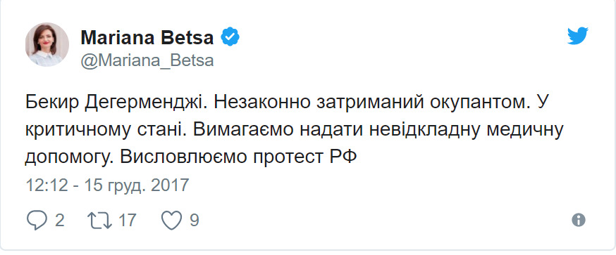 "Бекир Дегерменджі. Незаконно затриманий окупантом. У критичному стані. Вимагаємо надати невідкладну медичну допомогу. Висловлюємо протест РФ", - написала Беца.