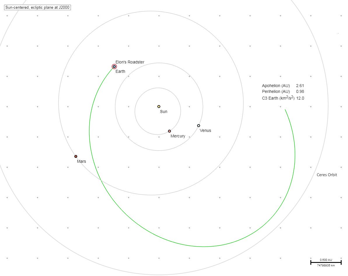 Стартувавши у вівторок на новітній ракеті-носії Falcon Heavy електромобіль Tesla Roadster залишив поле земного тяжіння і почав рух до поясу астероїдів по геліоцентричній орбіті.
