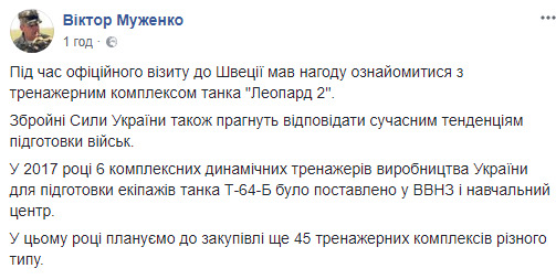"У 2017 році 6 комплексних динамічних тренажерів виробництва України для підготовки екіпажів танка Т-64-Б були поставлені у військові виші і навчальний центр. Цього року плануємо закупити ще 45 тренажерних комплексів різного типу", - написав Муженко.